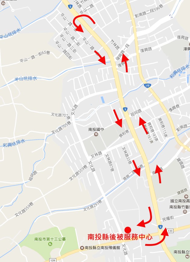 B路線(全長約3.6公里):民族路(南投縣後備服務中心)→左轉南崗二路→平山二路→迴轉(原路返回)→南崗二路→右轉民族路(起終點皆為南投縣後備服務中心門口)