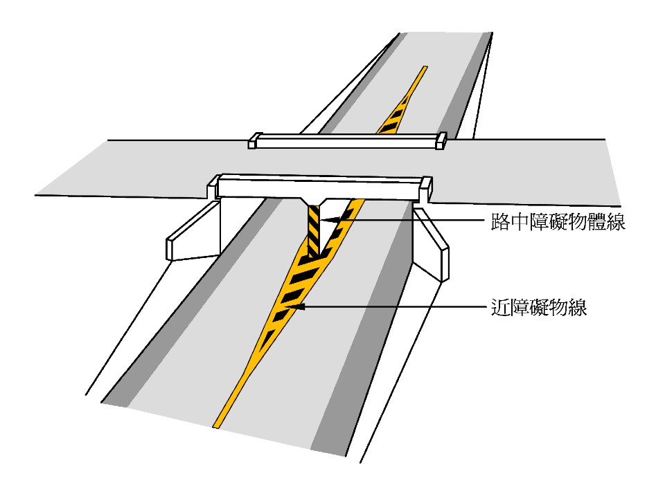 劃設於路中障礙物體上,為黃黑相間斜紋線,並在障礙物前方之路面上,設置近障礙物線。表示路上之障礙物體,促使車輛駕駛人提高警覺。