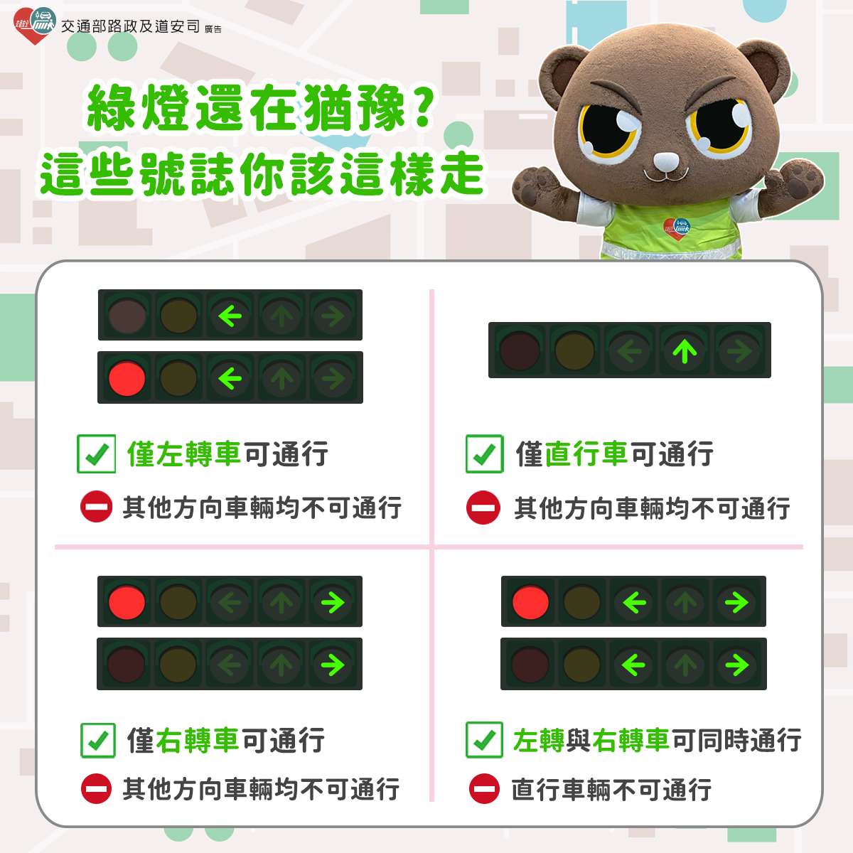 閃光綠燈,表示綠燈時段終了,未進入交岔路口之車輛,儘可能不超越停止線或進入路口。