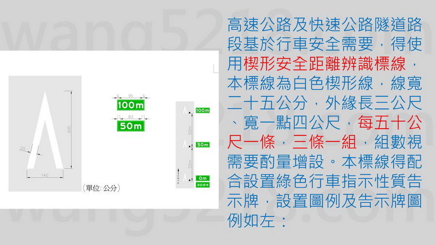 基於行車安全需要,得使用楔形安全距離辨識標線,並得配合設置綠色行車指示性質告示牌。